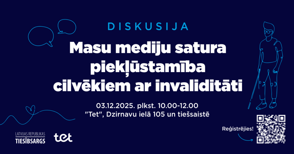 Informācija medijos cilvēkam nav tikai informatīva, izziņas vai izklaides vajadzība, tā atsevišķos gadījumos var būt arī veselības vai pat dzīvības cena. Tāpēc masu medijiem jābūt ne vien  pieejamiem jeb esošiem, bet arī piekļūstamiem – tādiem, lai visi cilvēki, arī ar invaliditāti, varētu uztvert un saprast mediju saturu.  Tāpēc 3.decembrī plkst. 10:00-12:00  Tiesībsarga birojs sadarbībā ar “Tet” rīko diskusiju “Masu mediju satura piekļūstamība cilvēkiem ar invaliditāti”.